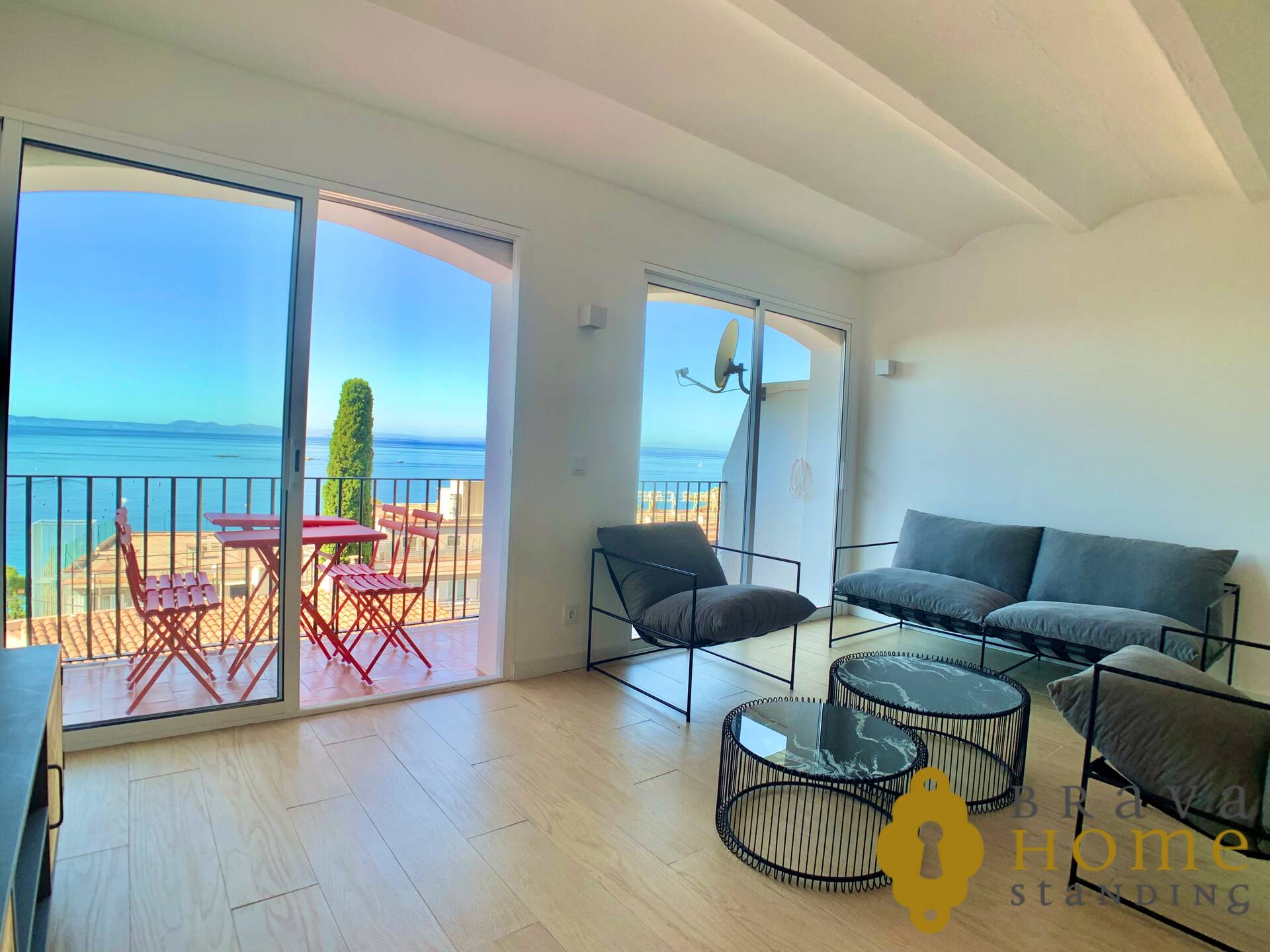 Ce splendide appartement se compose d'un grand séjour avec cuisine américaine et accès à la terrasse avec une superbe vue mer, deux chambres, et deux salles de bain.