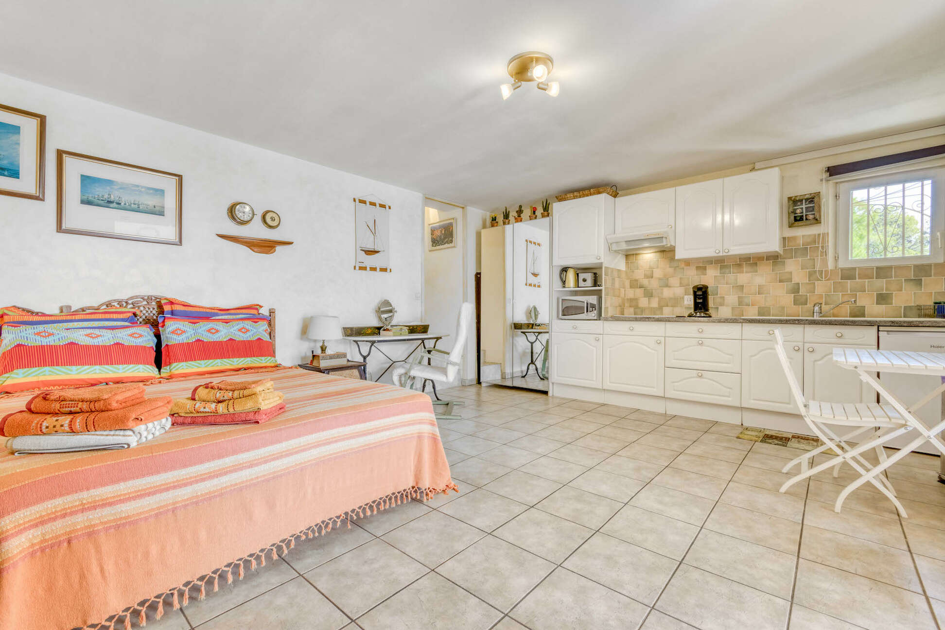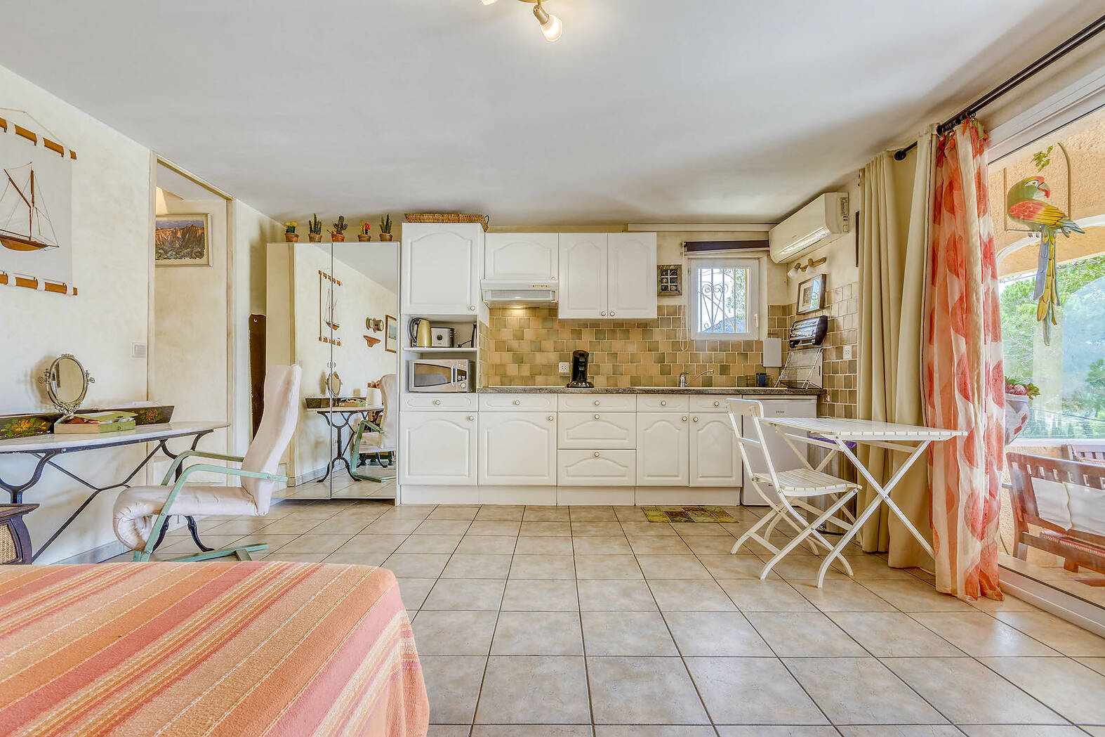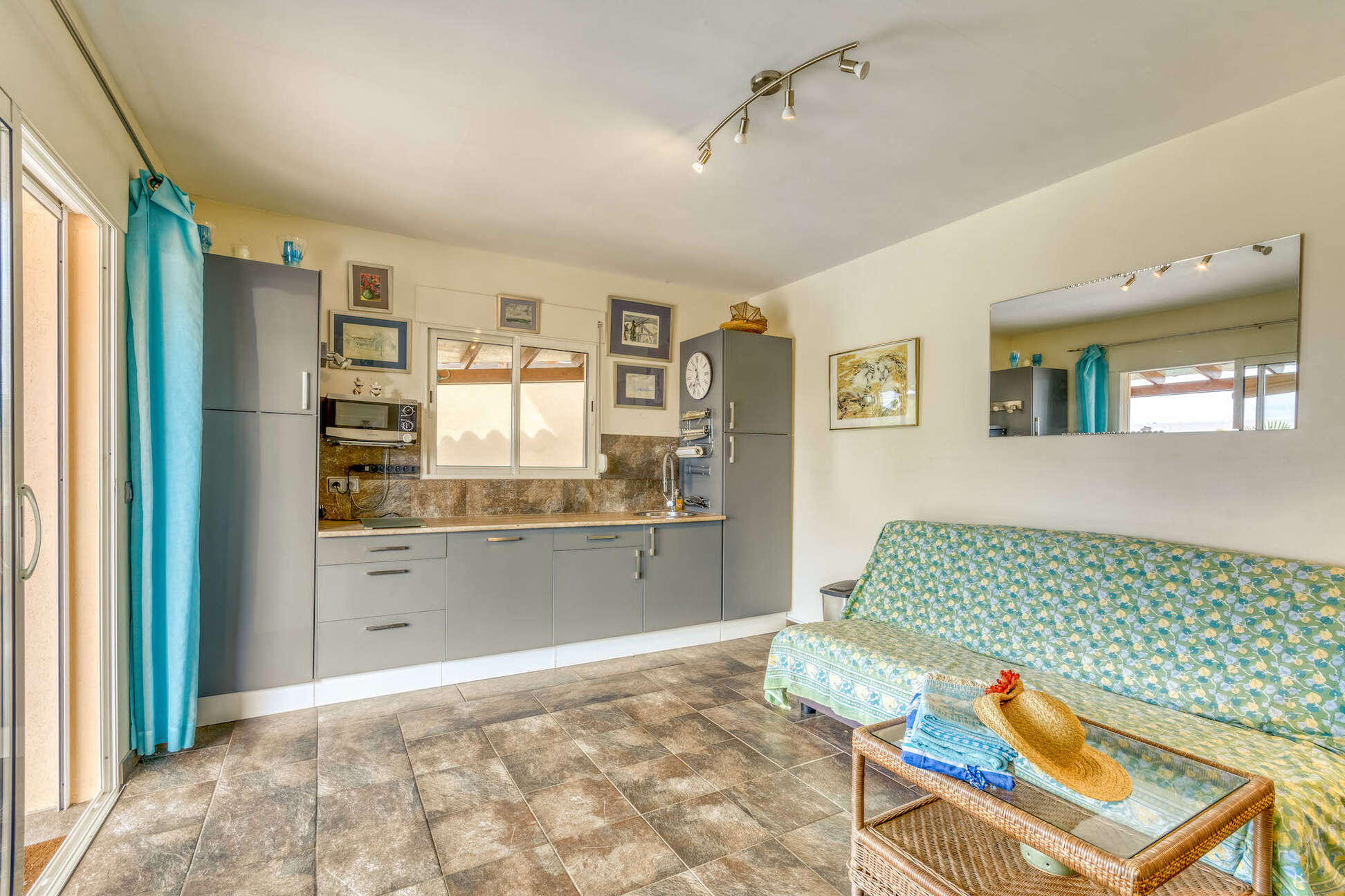 A l‘étage inférieur (rez-de-jardin): studio indépendant avec cuisine et salle de bain avec douche, pour amis ou pour location; terrasse-porche privée avec vue sur la mer; cuisine-salle à manger d‘été avec accès direct à la piscine; salle à manger extérieure indépendante, couverte; grand débarras.