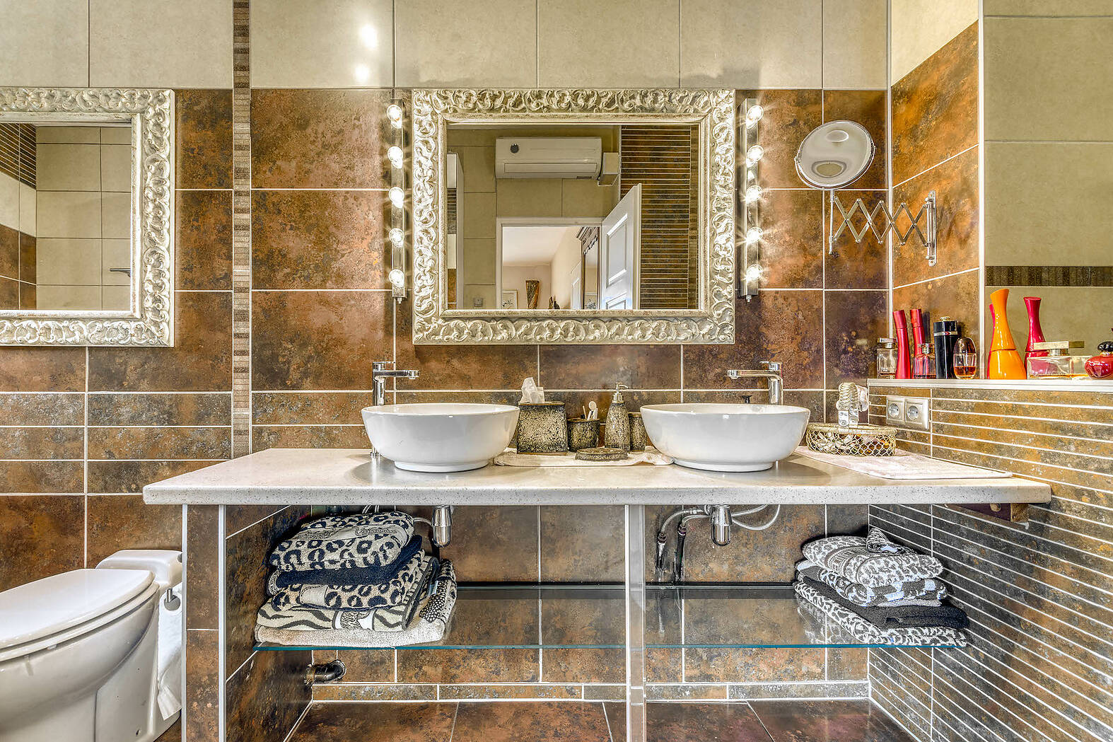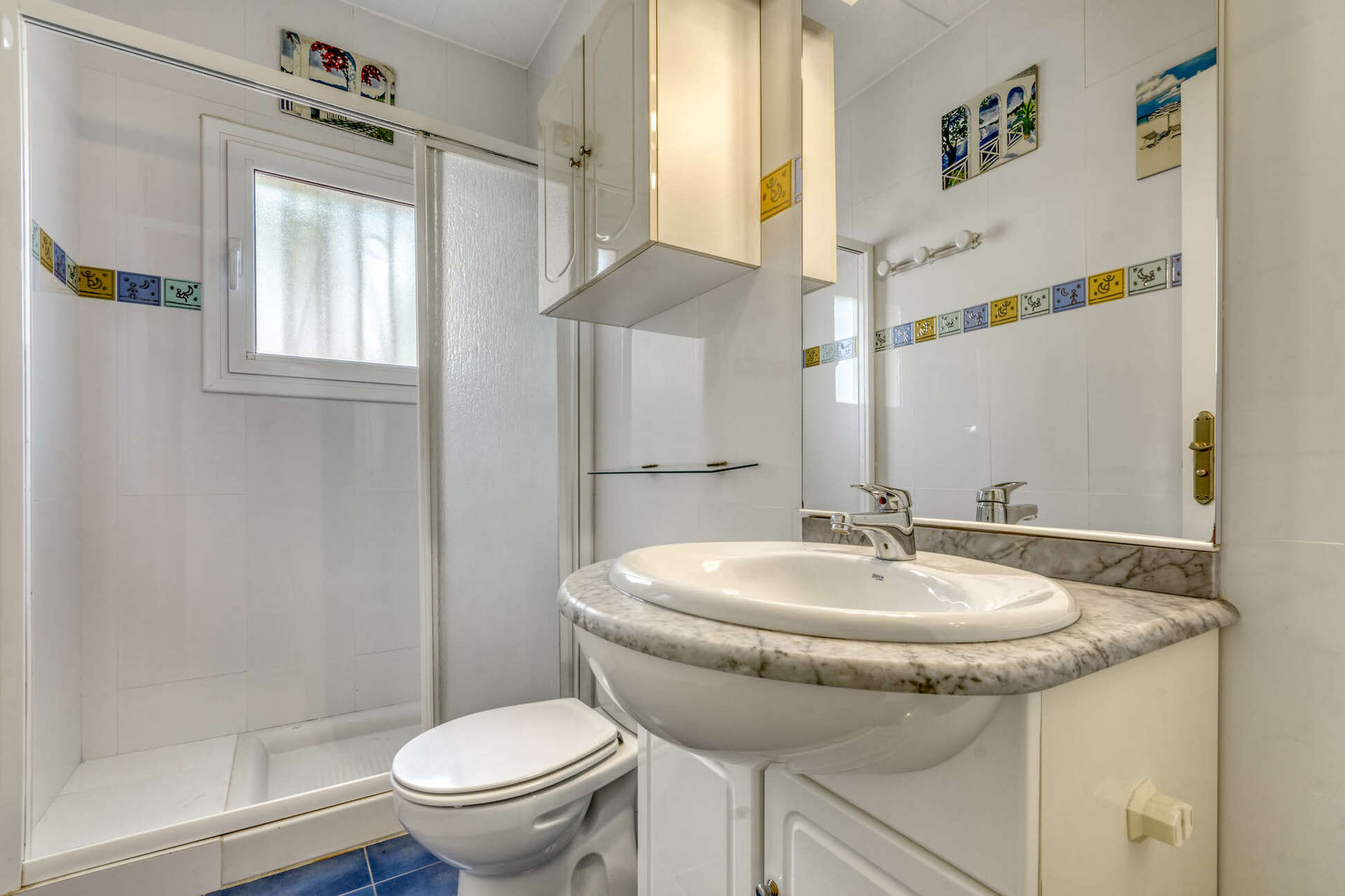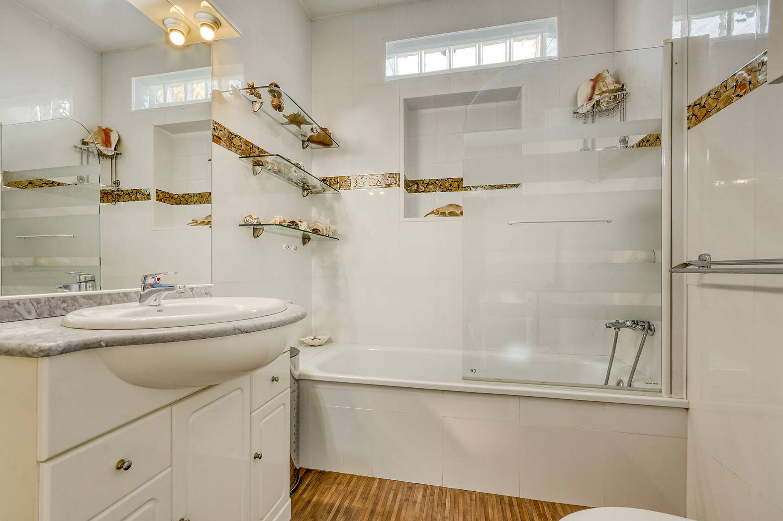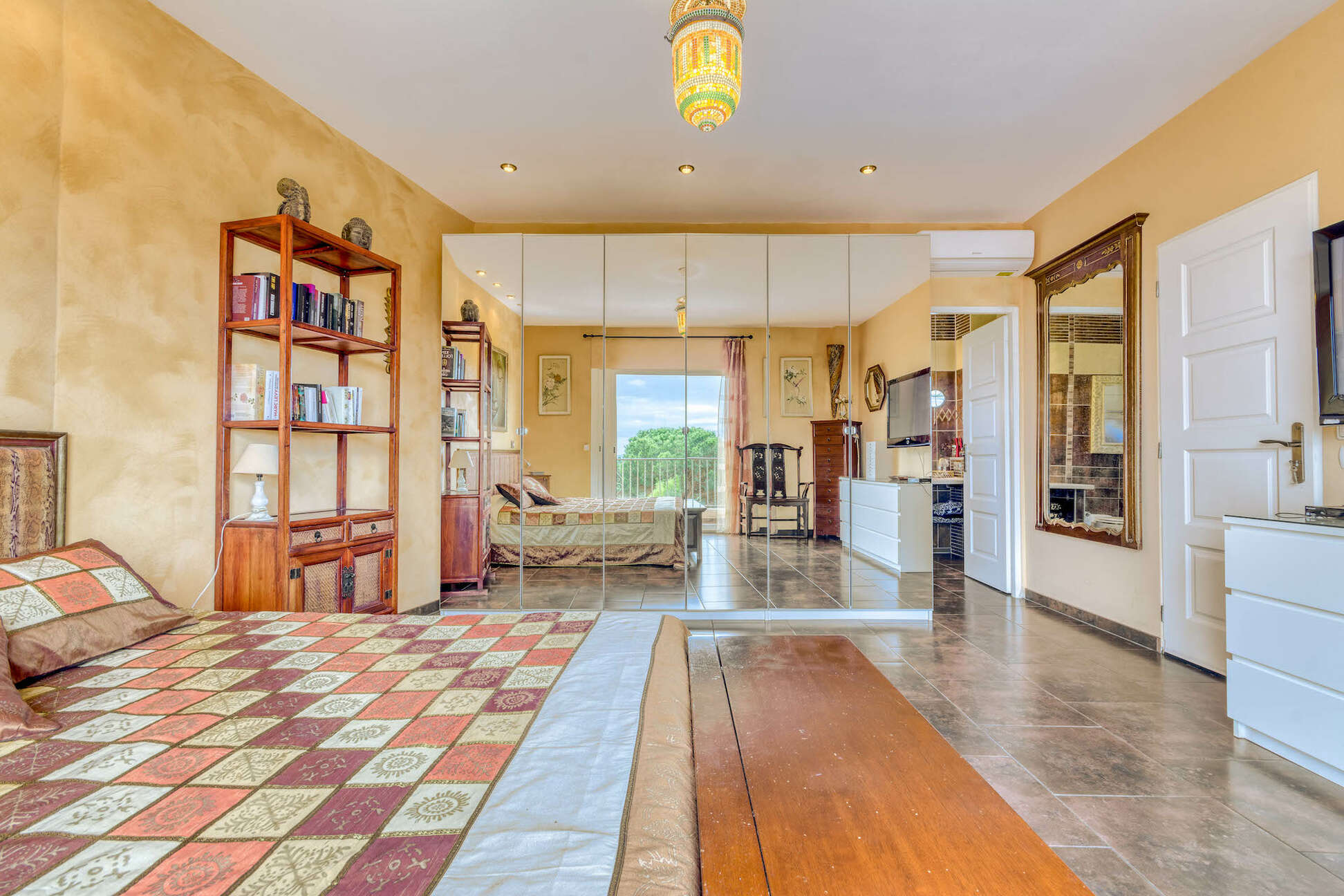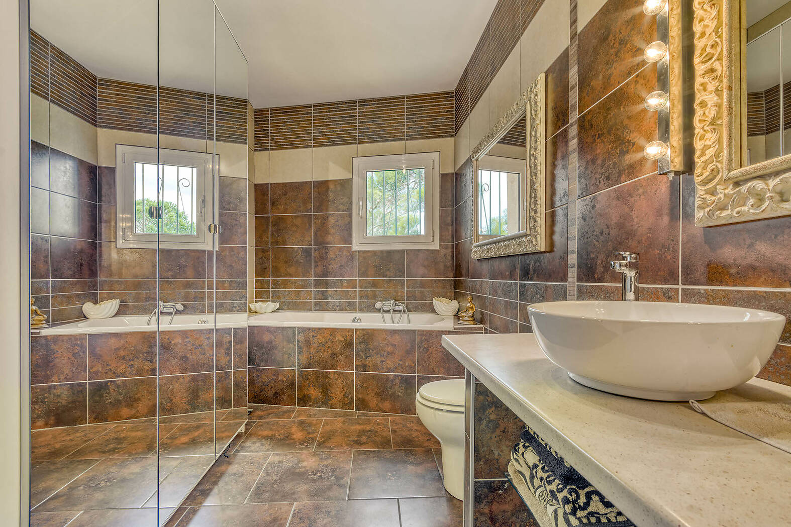 Aussi à l‘étage principal: une belle chambre suitée (avec gran balcon sur la piscine) dont la salle de bain comprend une douche italienne et une baignoire; deux chambres à coucher, une salle de douche et une salle de bain: il y a des WC dans chacune des 3 chambres; placards integrés dans toutes les chambres.