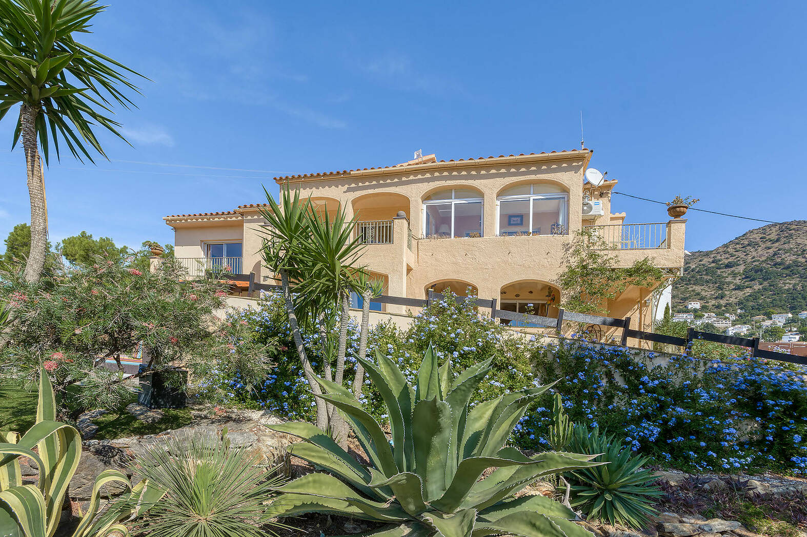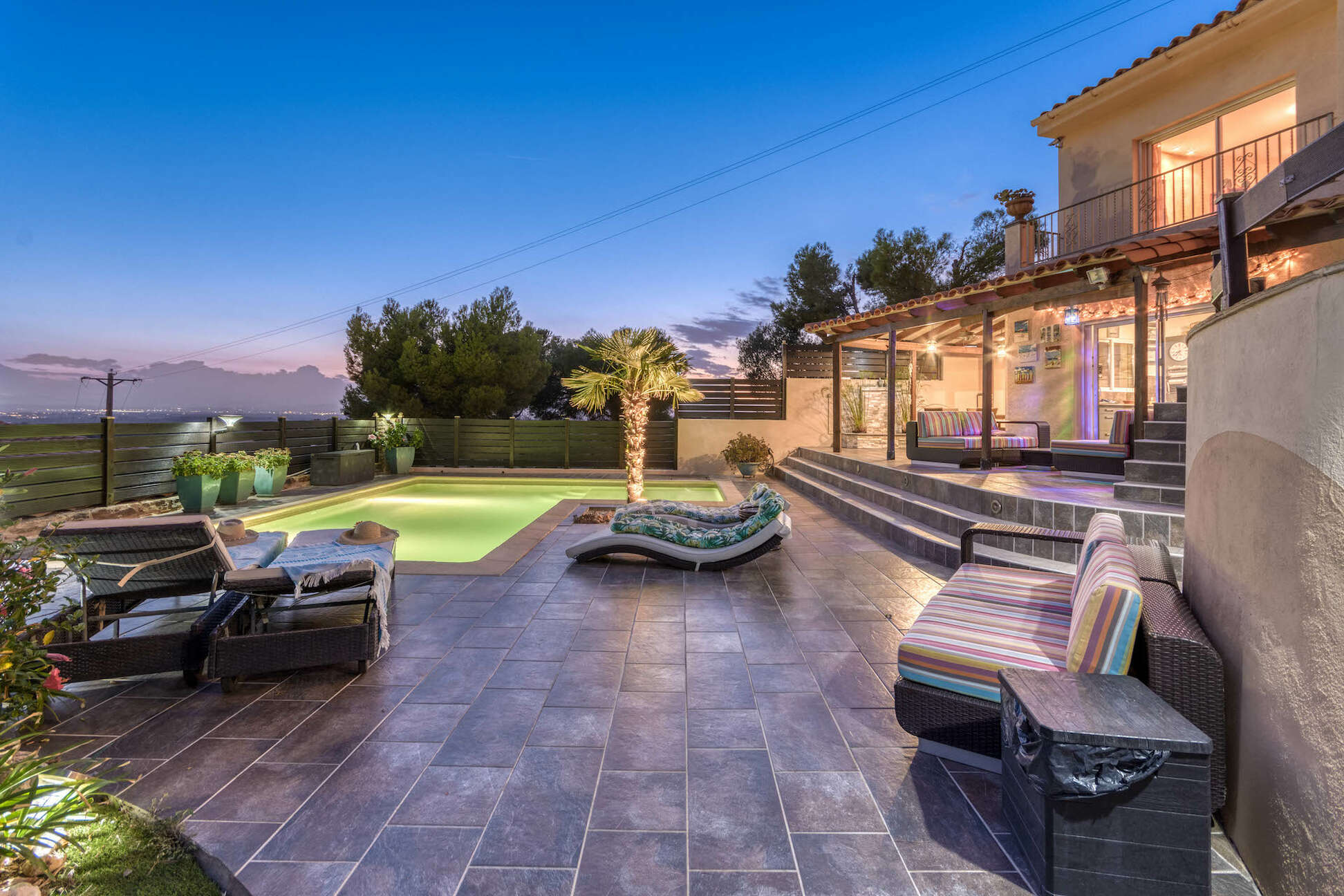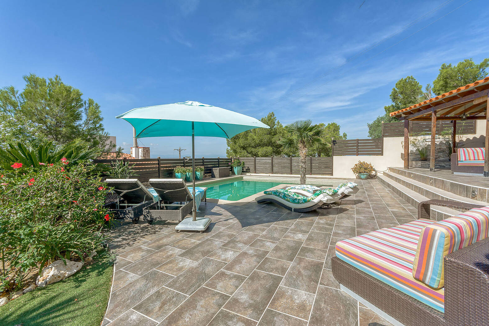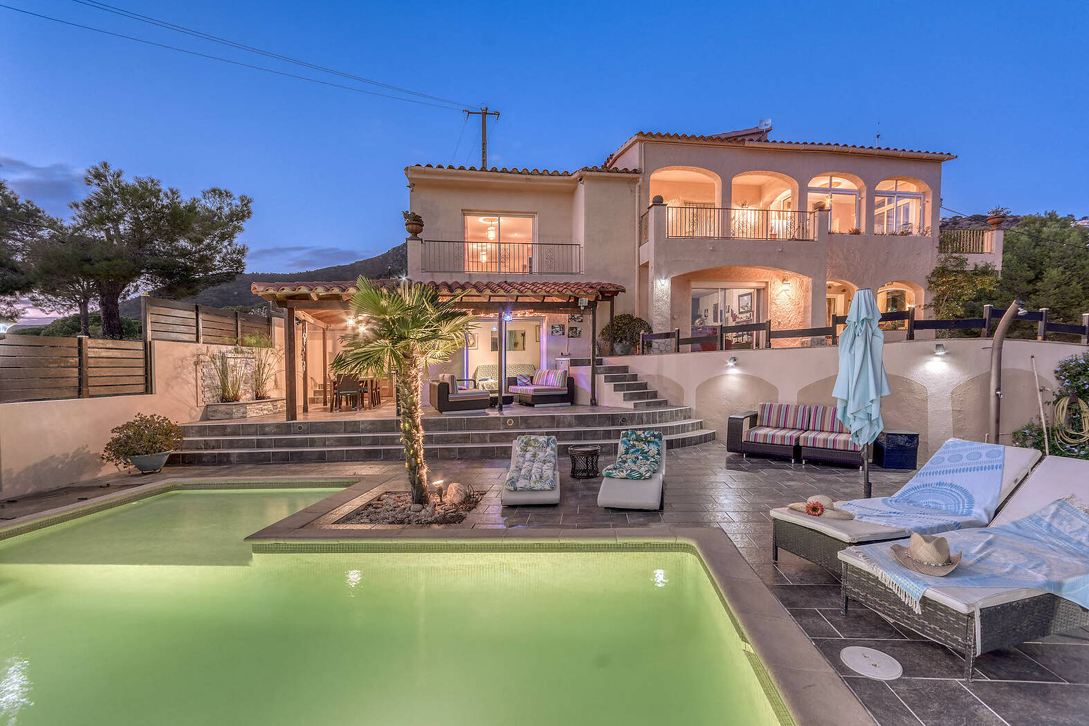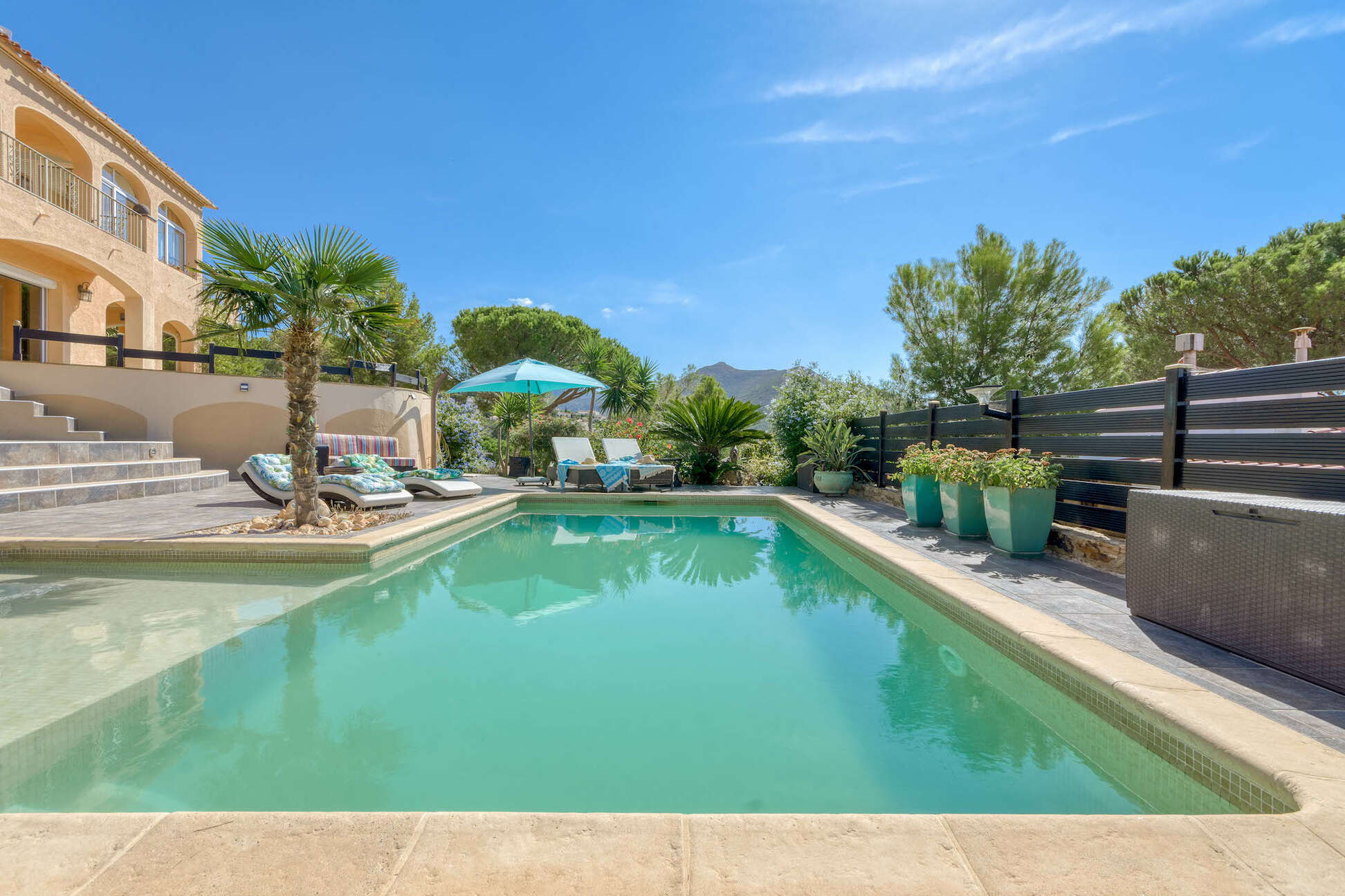 Orientée plein sud, avec vue panoramique sur mer et montagne, la maison est entourée de jardins paysagers de plus de 1.000 m2 avec une superbe piscine.