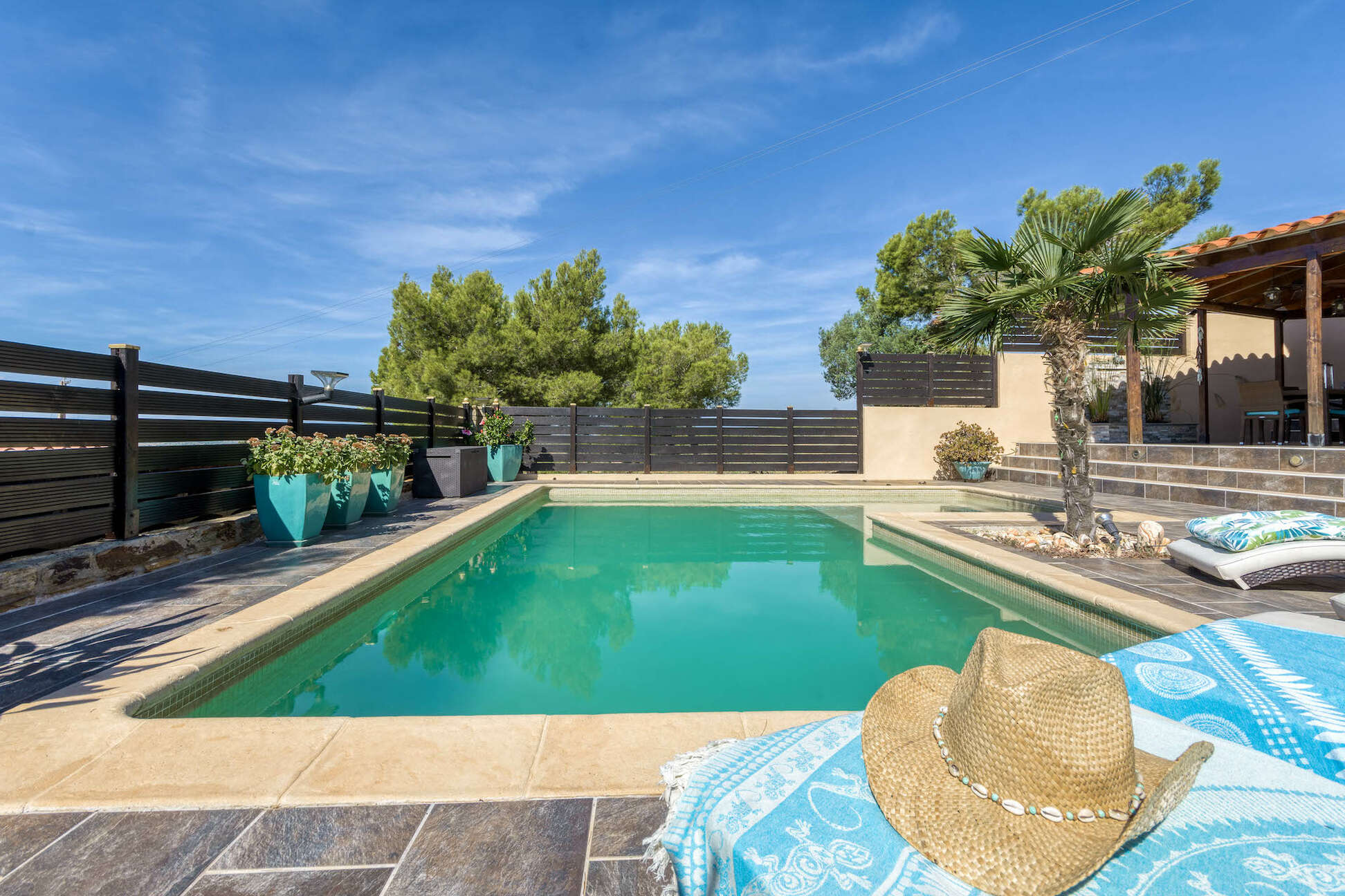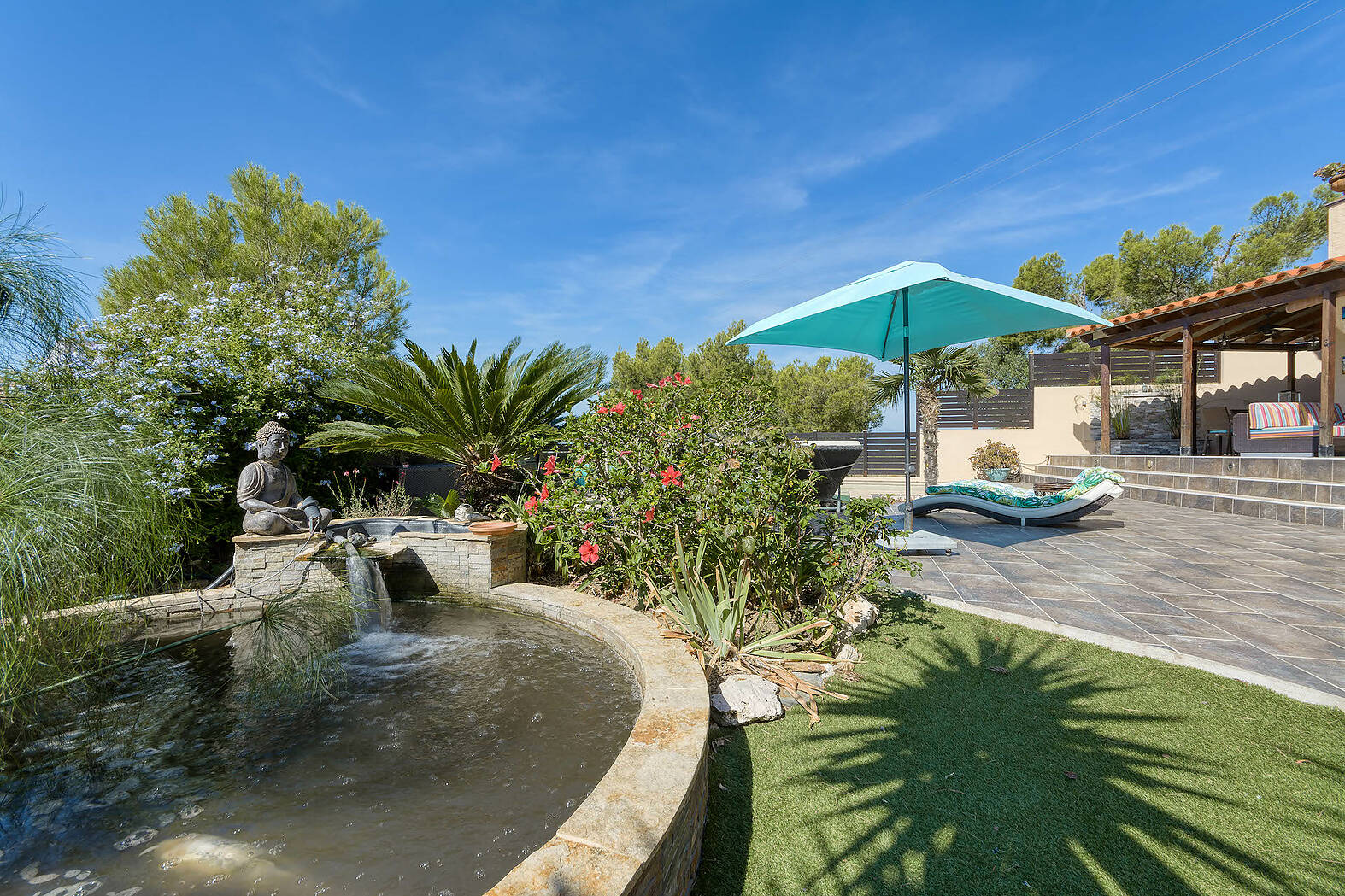 La zone de la piscine est vraiement spectaculaire, avec sa terrasse couverte, sa palme et une belle fontaine à poissons à côté. Jardin bien entretenu, avec des arbres matures (pins) et plusieures sortes de plantes.